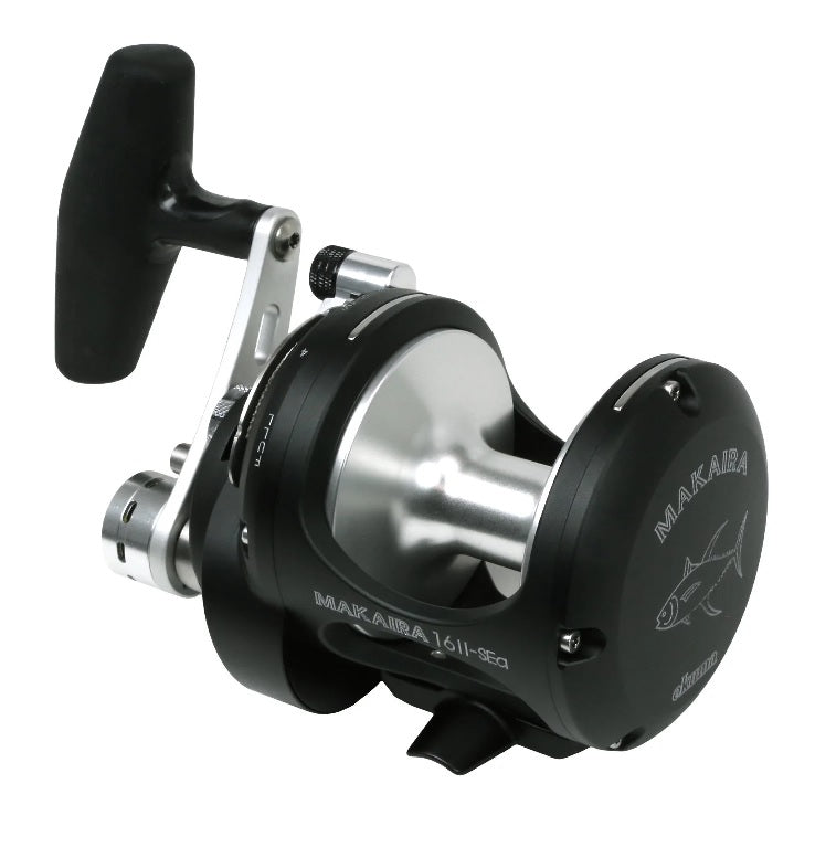 The Makaira SEa Black Lever Drag reel is a limited edition to the already popular Makaira family, which are all backed by a 5-year warranty. The silver-etched yellowfin tuna glistens as bright as the sea on top of the matte black anodized aluminum frame. This reel is as smooth as it is sleek with its Carbonite Dual Force drag system and its helical-cut gears. Its oversized handle and lower low-speed gearing versus the original Makaira serve up extreme torque for the Makaira SEa Black.