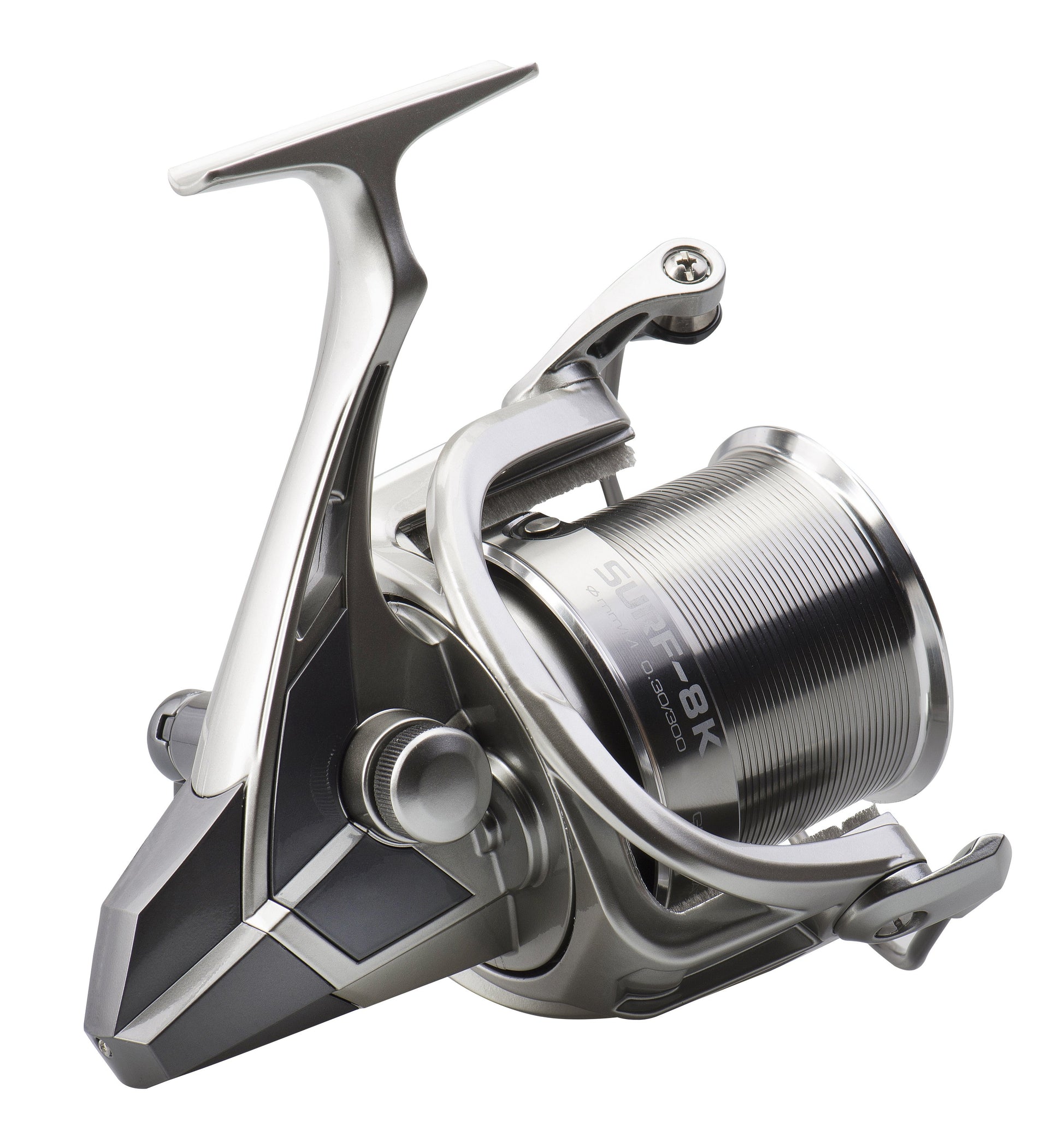 The Surf-8K long casting spinning reel brings its technology to one key size, the 8K. It contains 6 total stainless steel ball bearings and features a fish-stopping 40lbs of drag pressure with its carbonite drag washers.